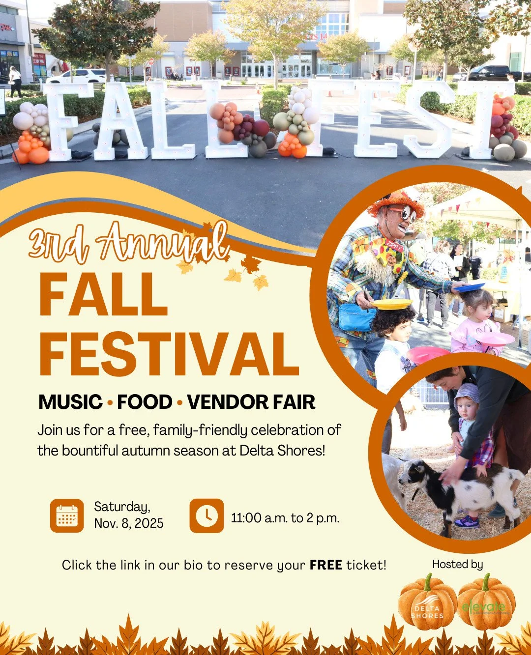 Our Fall Festival is back for the 3rd year in a row at Delta Shores! 🎉 Enjoy FREE family fun — petting zoo, face painting, crafts, photo ops, giveaways, vendors, music & more.